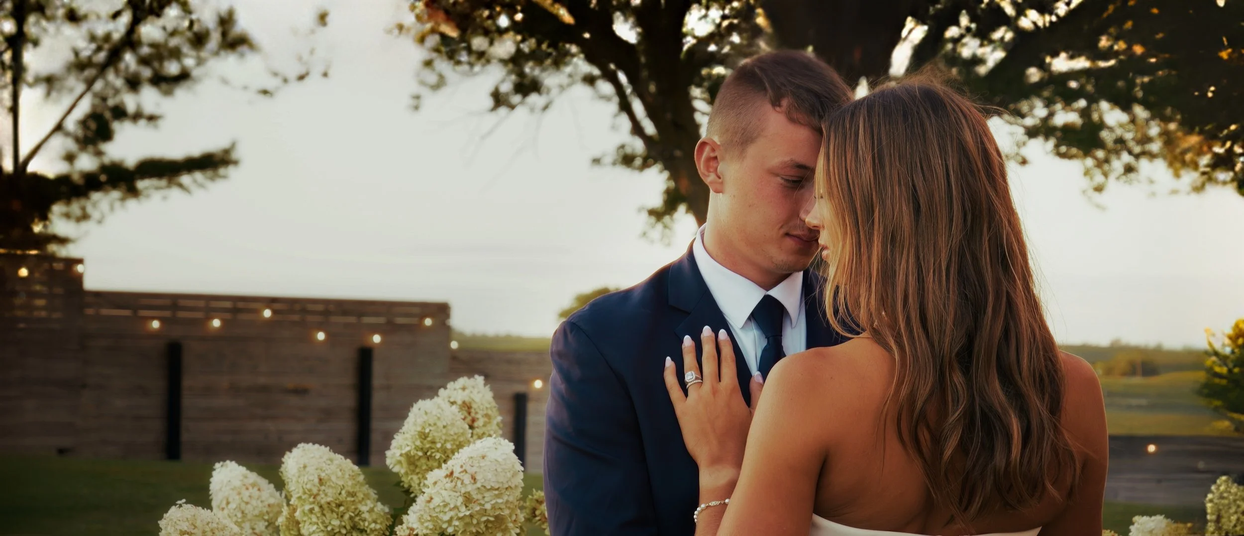 A bride and groom sharing a romantic moment outdoors during sunset, with trees and golden light in the background.